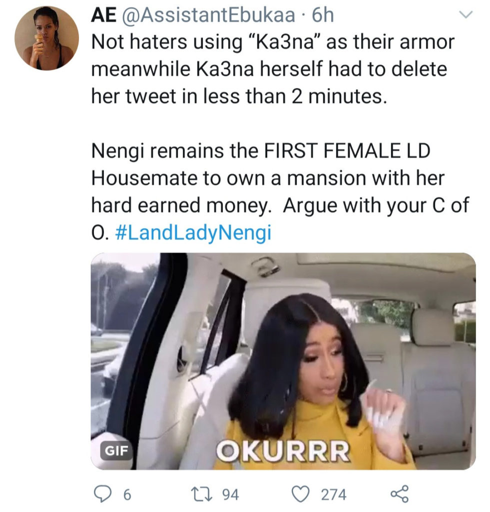 Big brother Naija star, Ka3na has disclosed that she bought a house with her hard-earned money before bbnaija. This is coming a few hours after Nengi announced she bought her new house.