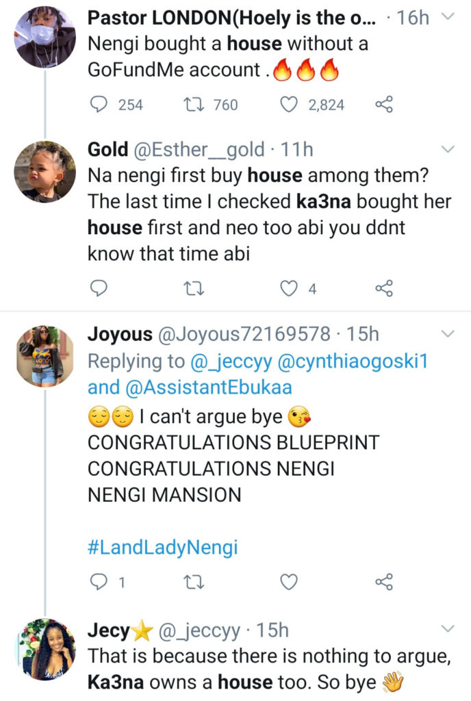 As Nengi declared openly her new house, her followers had thrown shades at other housemates claiming other housemates have not achieved the similar heights as Nengi.