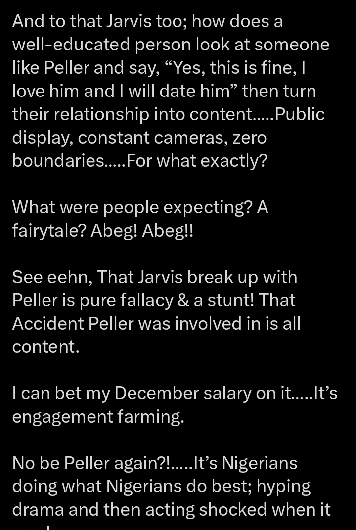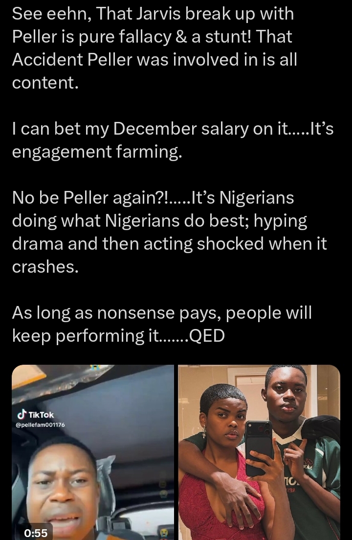 I can bet my December salary on it.t’s engagement farming. No be Peller again?! It’s Nigerians doing what Nigerians do best; hyping drama and then acting shocked when it crashes.