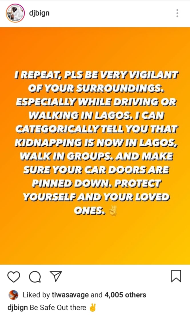 Via his Instagram page, DJ Big N announced that kidnapping is currently on rampage in Lagos state.