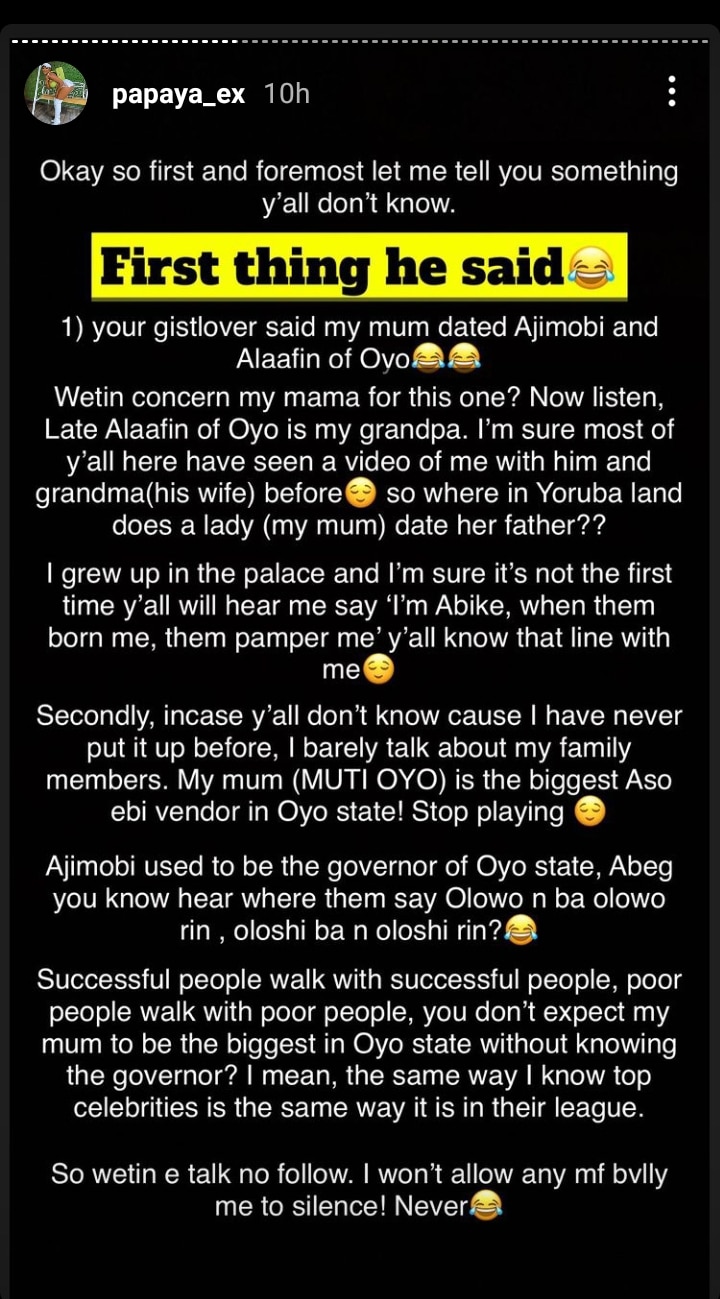 Reacting to these rumors, she has first cleared that her mum was never in a relationship with Alaafin of Oyo because he’s her grandfather and that Ajimobi, who was the then governor of Oyo, and her mum were friends, same way successful people are friends with other successful people.