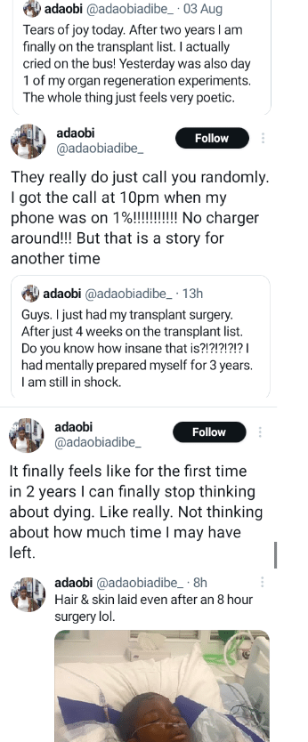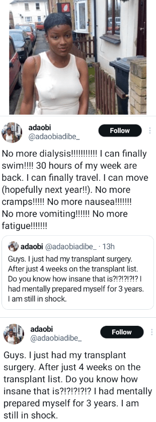 A Nigerian lady identified as Adaobi Adibe, has emerged victorious after undergoing a successful kidney transplant, bringing an end to her two-year battle with kidney disease.