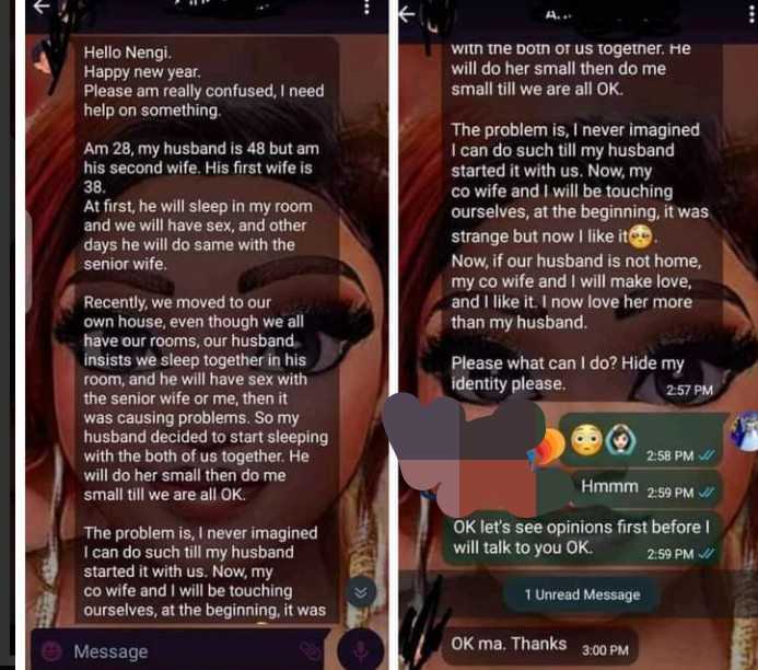 “The problem is, I never imagined I can do such till my husband started it with us. Now, my co wife and I will be touching ourselves, at the beginning, it was strange but now I like it.