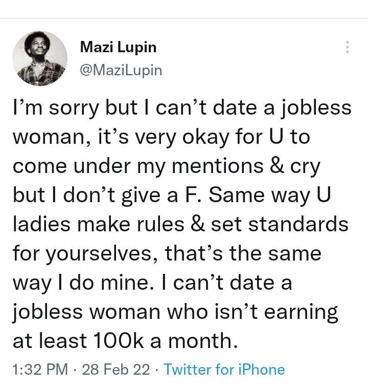“I’m sorry but I can’t date a jobless woman, it’s very okay for U to come under my mentions & cry but I don’t give a F. Same way U ladies make rules & set standards for yourselves, that’s the same way I do mine. I can’t date a jobless woman who isn’t earning at least 100k a month.”