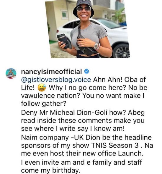 According to her, the man identified as Mr Micheal Dion-Goli who owns the company UK Dion is the headline sponsor of her show, TNIS Season 3. She also claimed to have hosted their new office launch and invited him, his family and staff to her birthday party.