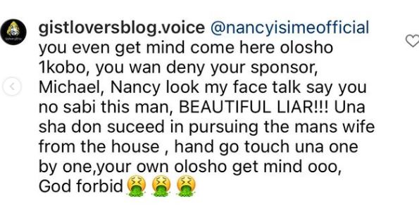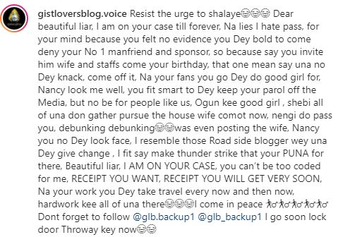 “Resist the urge to shalaye??? Dear beautiful liar, I am on your case till forever, Na lies I hate pass, for your mind because you felt no evidence you Dey bold to come deny your No 1 manfriend and sponsor, so because say you invite him wife and staffs come your birthday, that one mean say una no Dey knack, come off it, Na your fans you go Dey do good girl for, Nancy look me well, you fit smart to Dey keep your parol off the Media, but no be for people like us, Ogun kee good girl , shebi all of una don gather pursue the house wife comot now, nengi do pass you, debunking debunking??was even posting the wife, Nancy you no Dey look face, I resemble those Road side blogger wey una Dey give change , I fit say make thunder strike that your PUNA for there, Beautiful liar, I AM ON YOUR CASE, you can’t be too coded for me, RECEIPT YOU WANT, RECEIPT YOU WILL GET VERY SOON, Na your work you Dey take travel every now and then now, hardwork kee all of una there???I come in peace ?♂️?♂️?♂️?♂️?♂️.