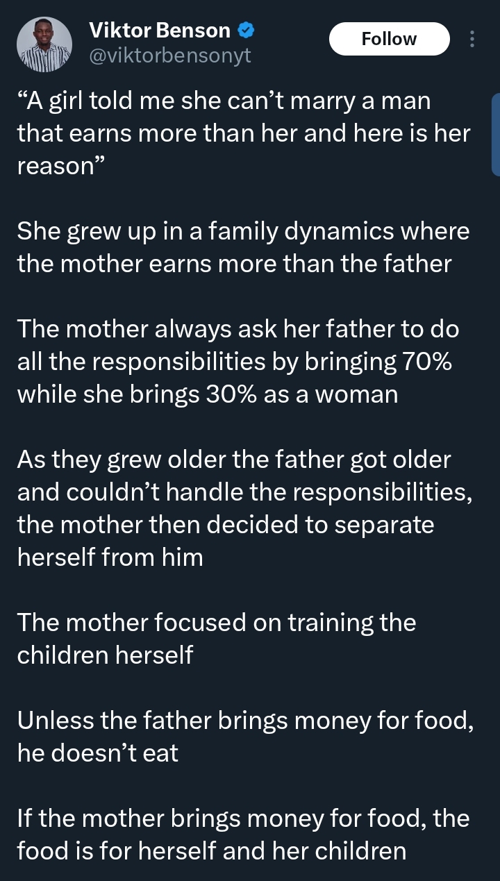 A man recently shared a striking story on X (formerly Twitter) about a lady who said she could never marry a man who earns more than her.