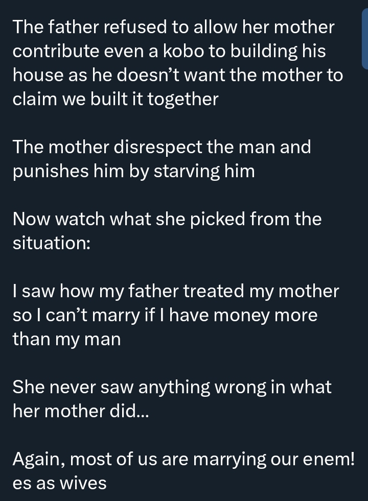 The post concluded with a reflection from the man: “Most of us are marrying our enemies as wives,” highlighting the complex influence of childhood experiences on adult relationships.