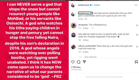In reaction to the revelations of Pastor Adeboye, Daddy Freeze has taken to his page to slam the man of God, saying he will not serve a god that can’t save young and promising artists like Mohbad and his servant Osinachi.