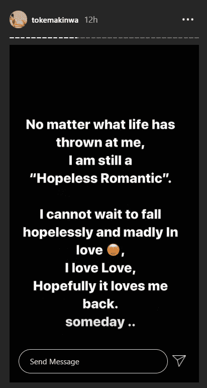 The 35 year old radio host, took to her Instagram page to say that she is still a hopeless romantic despite what life has thrown to her, and that she can’t wait to fall in love again.