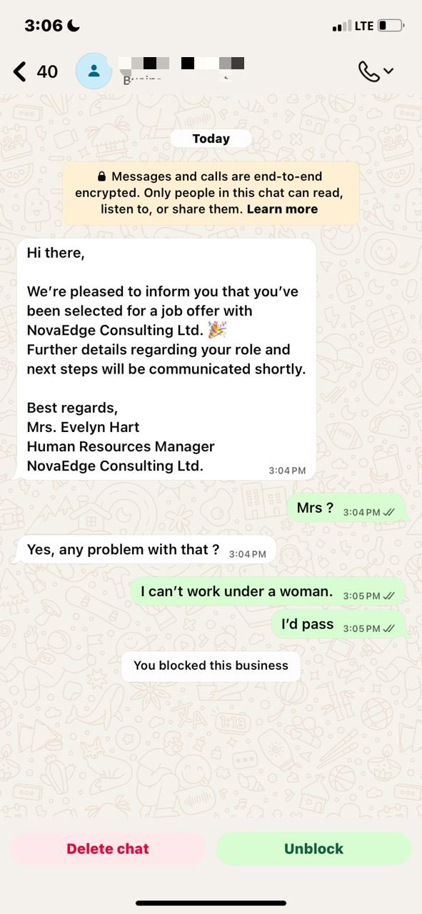 The circulating screenshot further showed that after making his stance clear, the man proceeded to block the recruiter, cutting off further communication.
