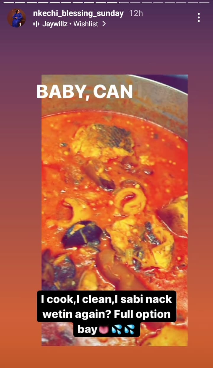 She shared a video of what looks like a pot of soup on her Instastory as she described herself as a full option babe who knows how to cook, clean and good in the bedroom.