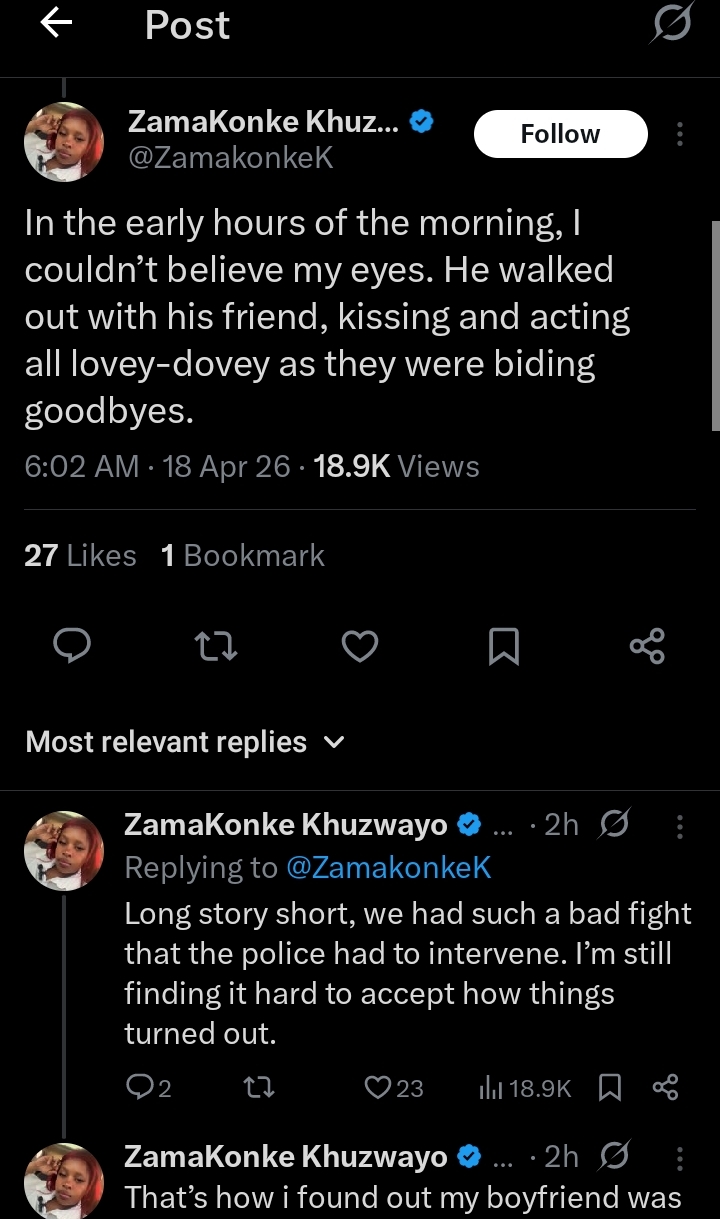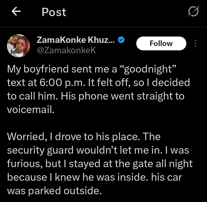 The lady, @Zamakonkex on X (formerly Twitter), shared that her boyfriend sent her a ‘good night’ text at exactly 6pm.