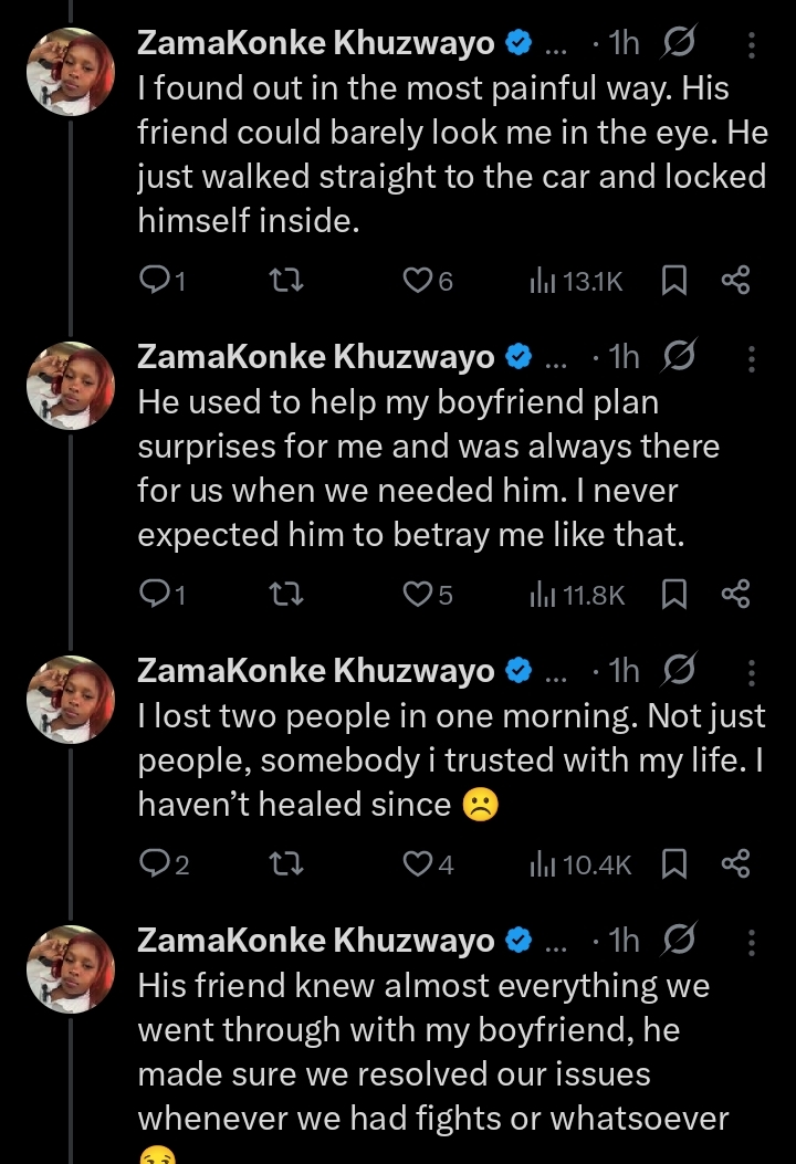 ”I found out in the most painful way. His friend could barely look me in the eye. He just walked straight to the car and locked himself inside. He used to help my boyfriend plan surprises for me and was always there for us when we needed him. I never expected him to betray me like that”, She stated.