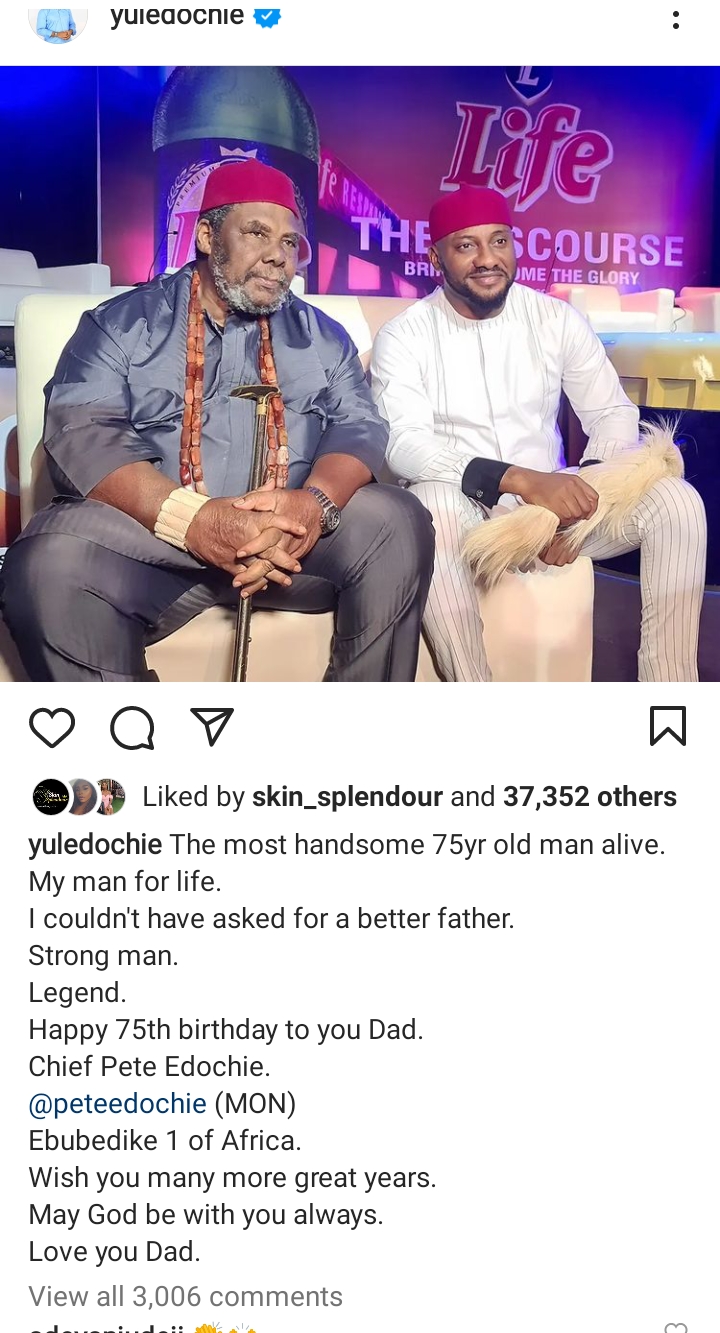“The most handsome 75yr old man alive. My man for life. I couldn’t have asked for a better father. Strong man. Legend. Happy 75th birthday to you Dad. Chief Pete Edochie. @peteedochie (MON) Ebubedike 1 of Africa. Wish you many more great years. May God be with you always. Love you Dad.”