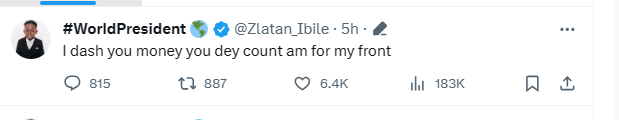 “I dash you money you dey count am for my front,” he wrote.