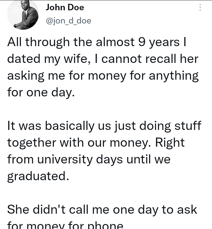 “All through the almost 9 years I dated my wife, I cannot recall her asking me for money for anything for one day.