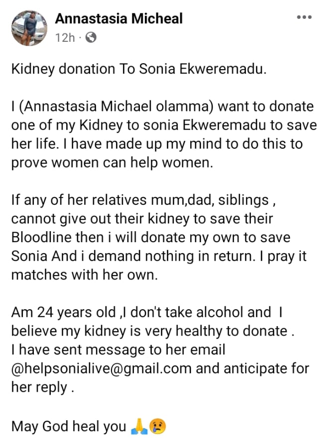“If any of her relatives mum,dad, siblings , cannot give out their kidney to save their Bloodline then i will donate my own to save Sonia And i demand nothing in return. I pray it matches with her own.