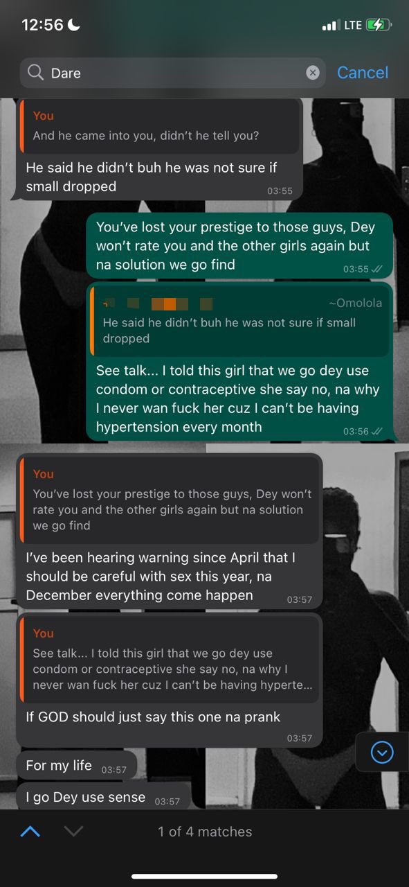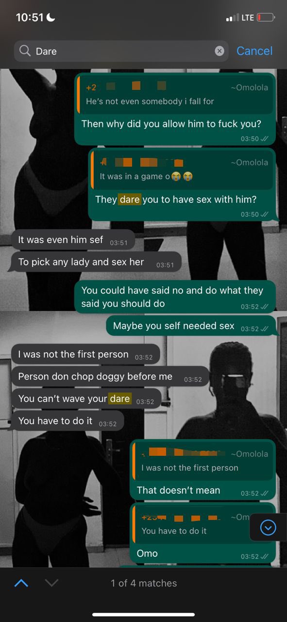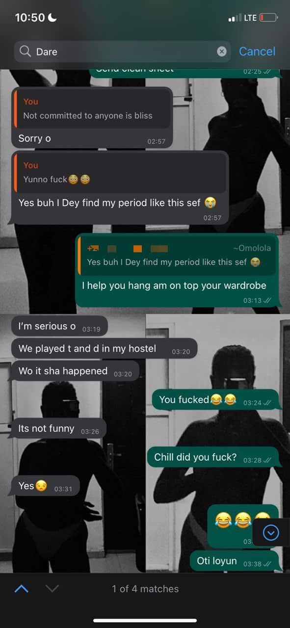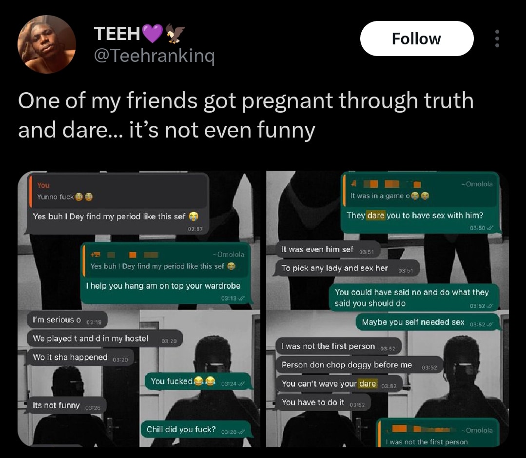 A Nigerian man, @Teehrankinq, has shared a chat on his social media page between himself and a lady who according to him, became pregnant after a guy chose her during a truth or dare game at their school hostel.