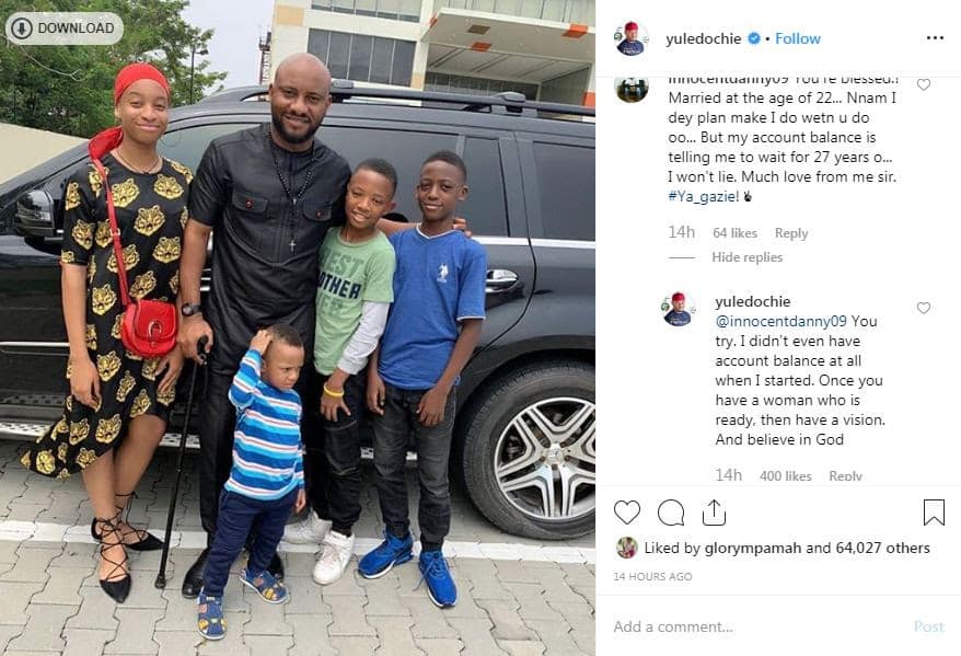 Yul Edochie says he didn’t have an account balance (money) when he decided to get married at a very young age.