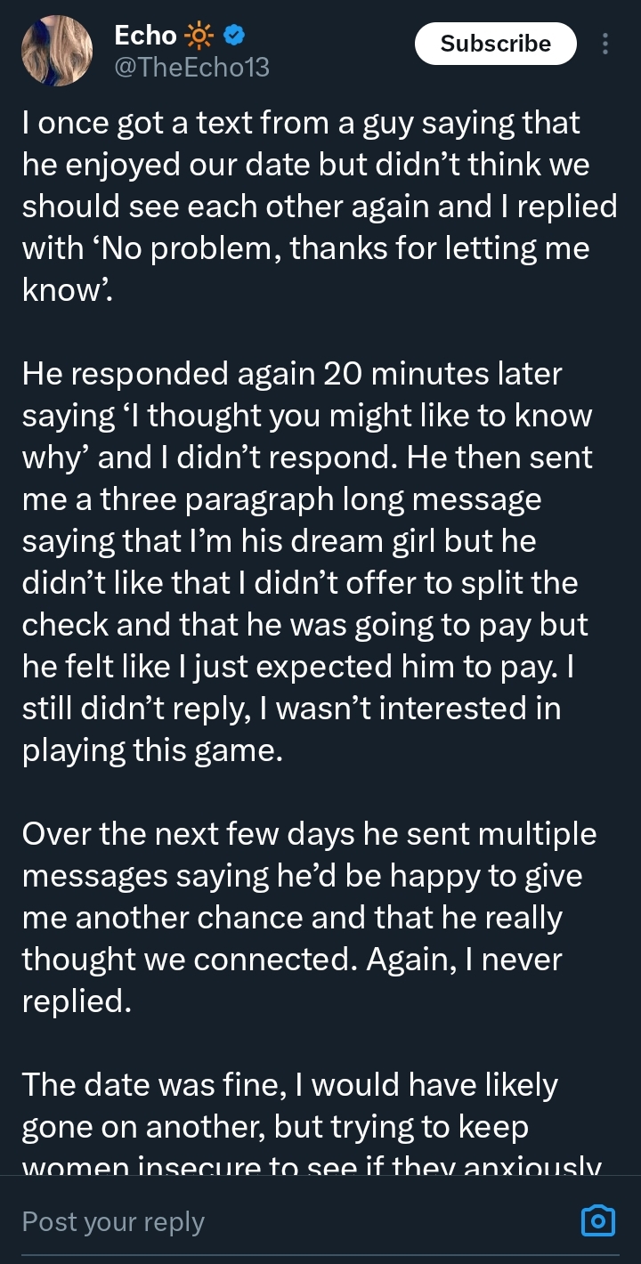 She explained that while the date itself was fine and she “would have likely gone on another,” she was not interested in what she viewed as a tactic to create insecurity.