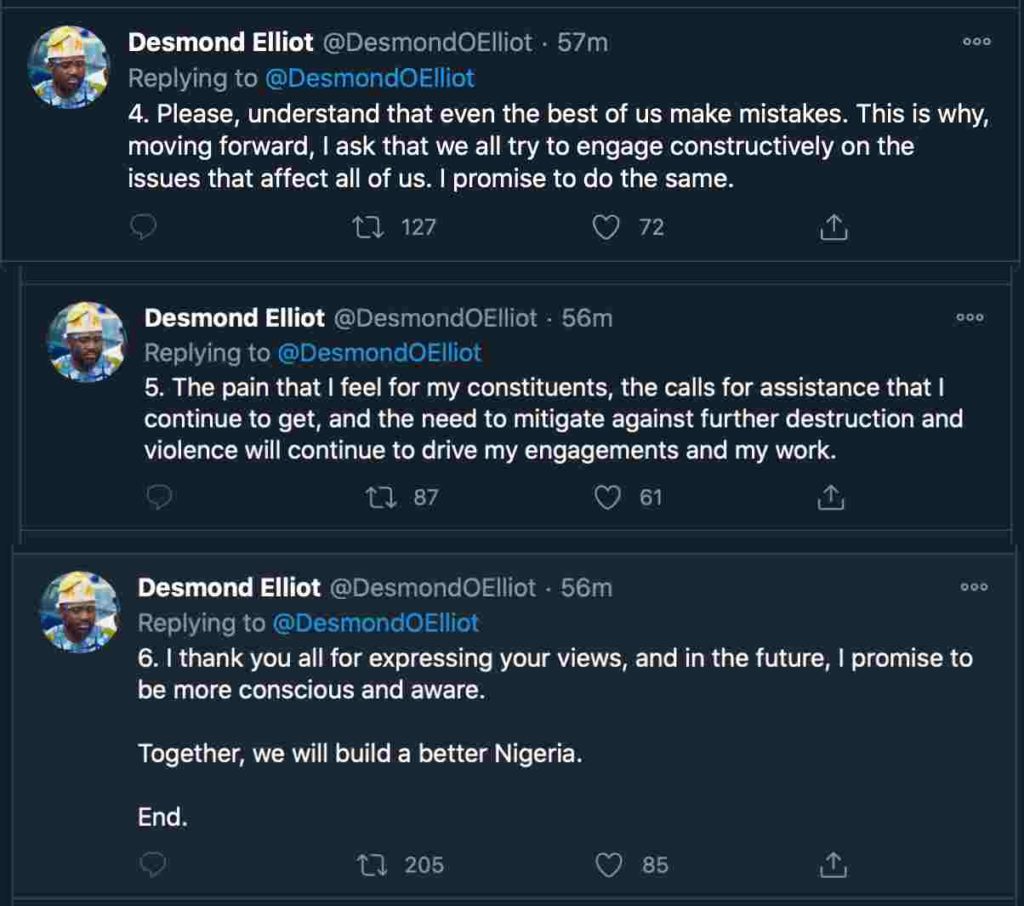 I thank you all for expressing your views, and in the future, I promise to be more conscious and aware. Together, we will build a better Nigeria.”