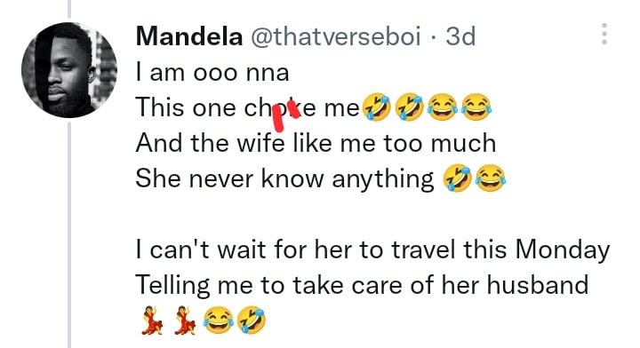 According to the Twitter user, the man’s wife has no knowledge about what’s been going on between them; he also expressed his anticipation at waiting for her to travel out again.