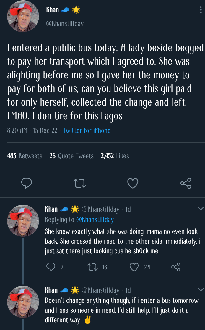 “I entered a public bus today, A lady beside begged to pay her transport which I agreed to. She was alighting before me so I gave her the money to pay for both of us, can you believe this girl paid for only herself, collected the change and left LMAO. I don tire for this Lagos