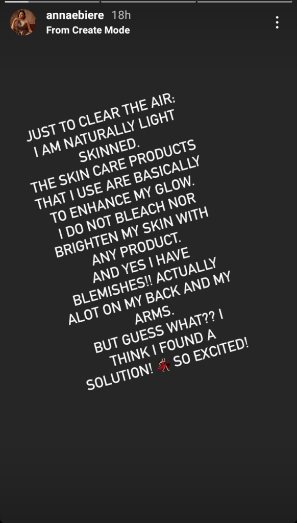 In her words, “Just to clear the air. I am naturally light skinned. The skin care products that I use are basically to enhance my glow. I do not bleach nor brighten my skin with any product. And yes, I have blemishes. Actually a lot on my back and arms.”