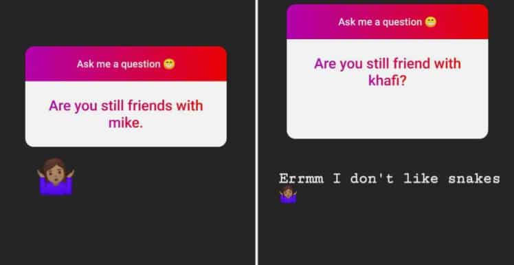 A follower had asked the tech queen if she is still friends with Khafi. Responding to the question, Jackye noted that she does not like ‘snakes’
