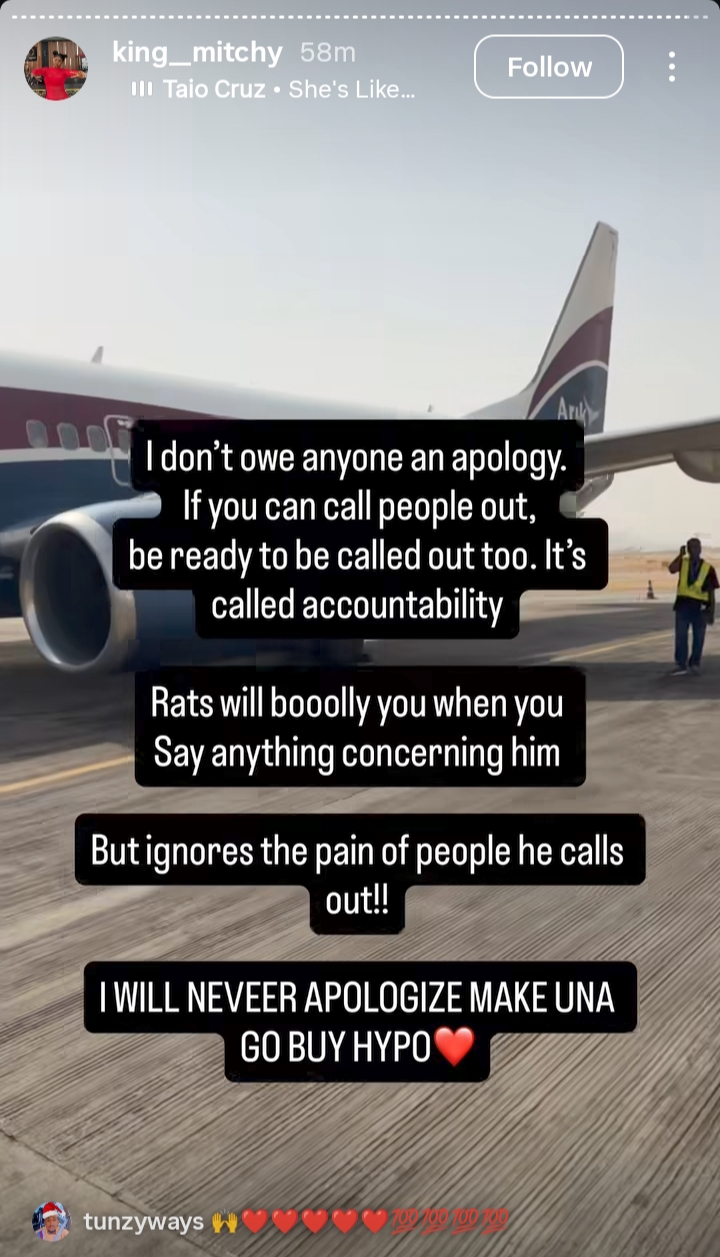 “I don’t owe anyone an apology. If you can call people out, be ready to be called out too. It’s called accountability – Rats will booolly you when you Say anything concerning him But ignores the pain of people he calls out!! I WILL NEVEER APOLOGIZE MAKE UNA GOBUY HYPO”