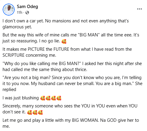 “I don’t own a car but the way my wife calls me big man is so reassuring” – Man says