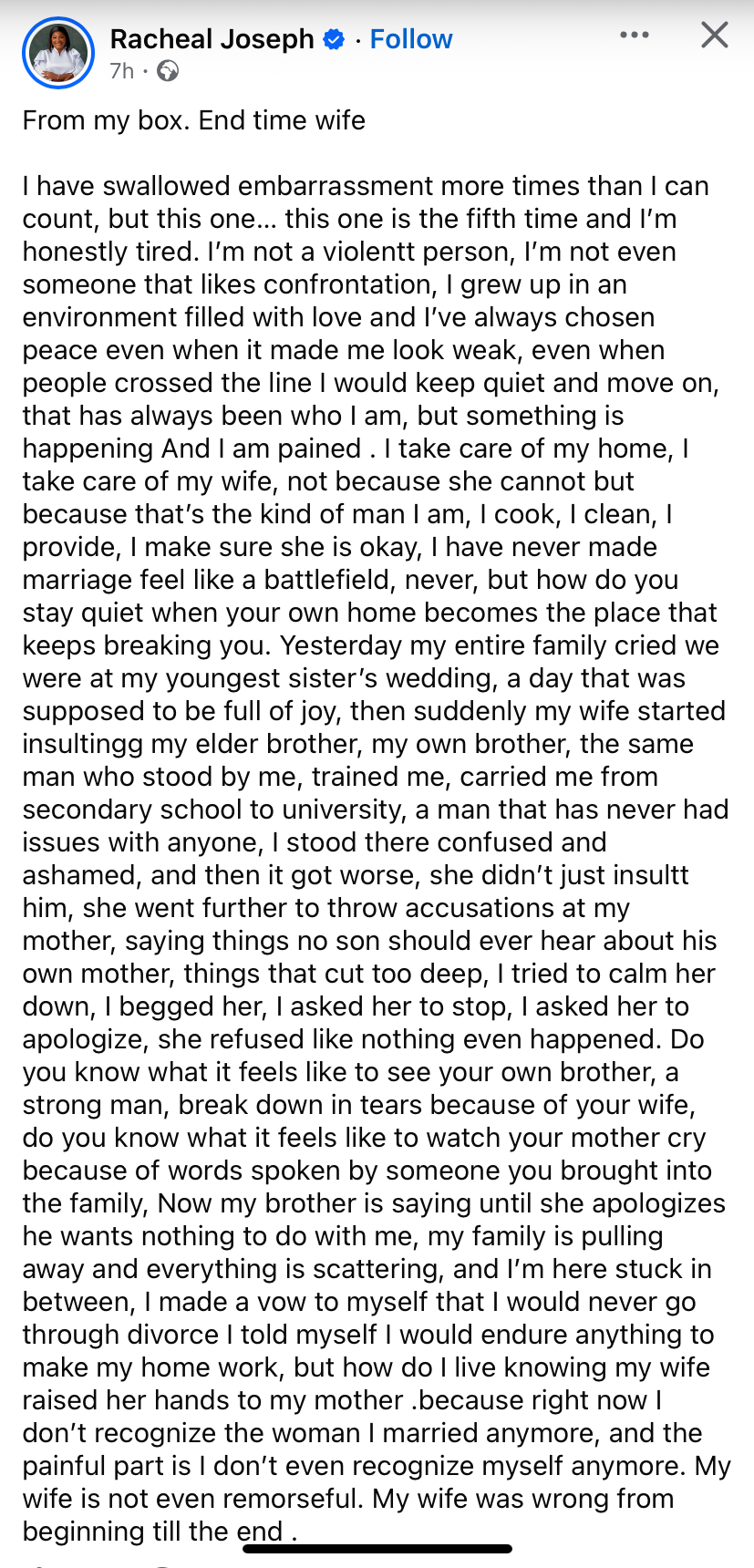 The story, shared by Racheal Joseph on Facebook, captured the man’s frustration as he detailed how repeated episodes of embarrassment in his marriage have pushed him to his limit.