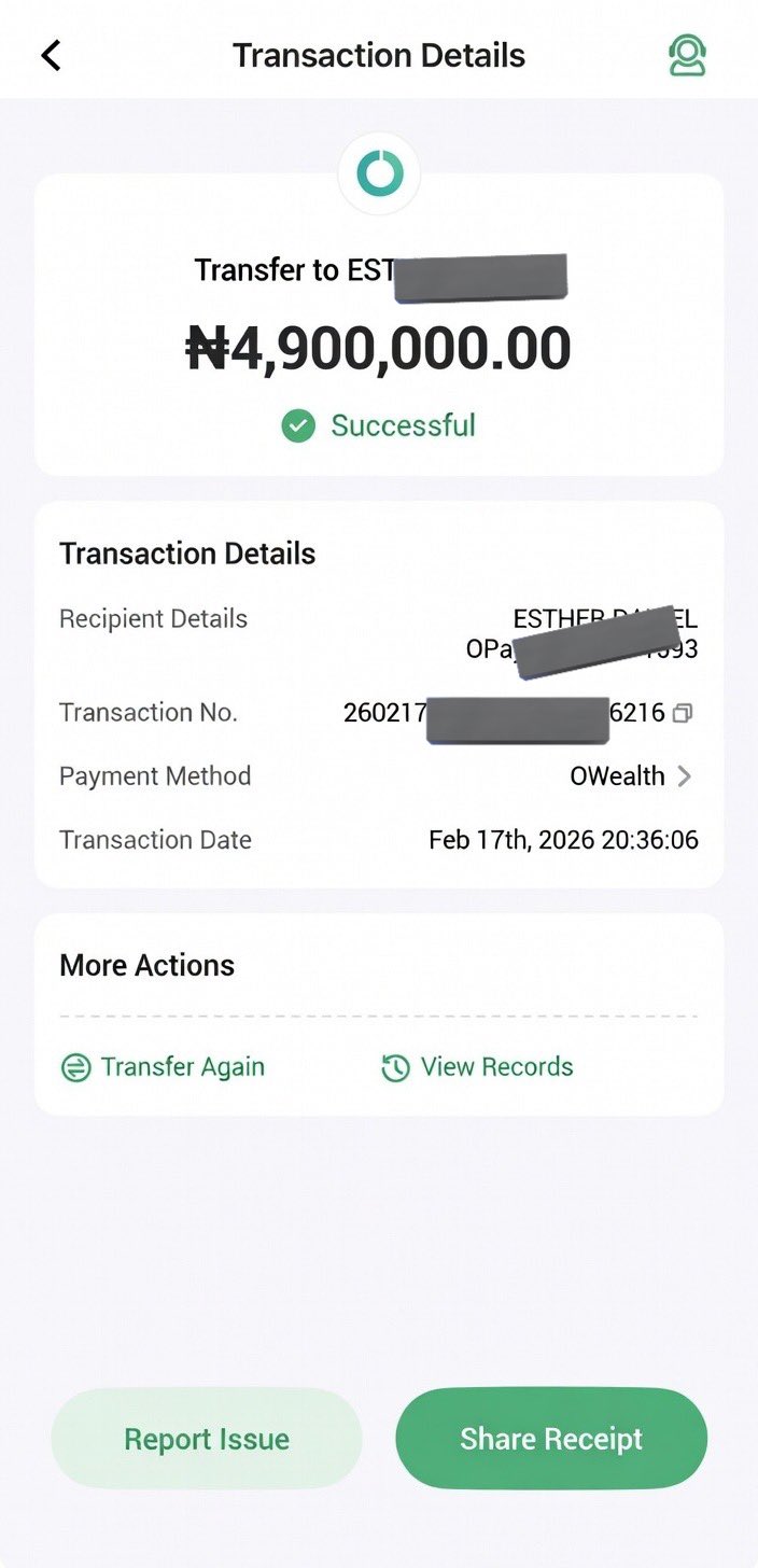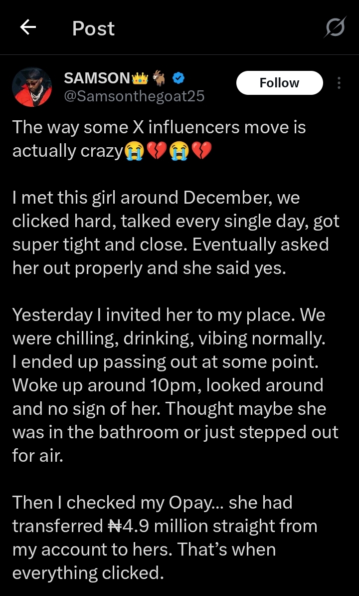 ” Thought maybe she was in the bathroom or just stepped out for air.Then I checked my Opay. She transferred ₦4.9 million straight from my account to hers. That’s when everything clicked”,The tweet reads in part .