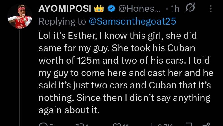 “Lol it’s Esther, I know this girl, she did same for my guy. She took his Cuban worth of 125m and two of his cars. I told my guy to come here and cast her and he said it’s just two cars and Cuban that it’s nothing. Since then I didn’t say anything again about it”, He narrated.
