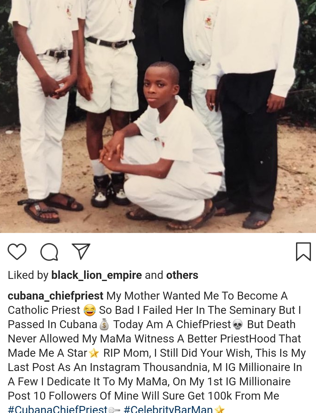 “My Mother Wanted Me To Become A Catholic Priest ? So Bad I Failed Her In The Seminary But I Passed In Cubana? Today Am A ChiefPriest? But Death Never Allowed My MaMa Witness A Better PriestHood That Made Me A Star? RIP Mom, I Still Did Your Wish, This Is My Last Post As An Instagram Thousandnia, M IG Millionaire In A Few I Dedicate It To My MaMa, On My 1st IG Millionaire Post 10 Followers Of Mine Will Sure Get 100k From Me #CubanaChiefPriest? #CelebrityBarMan?”
