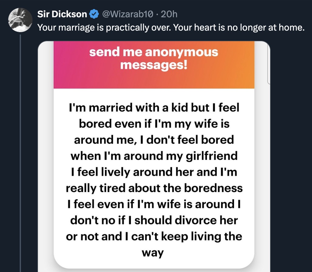 The embattled husband, who already has a child with his wife, shared his concerns via an anonymous message to X influencer @Wizarab10, questioning whether he should file for divorce.