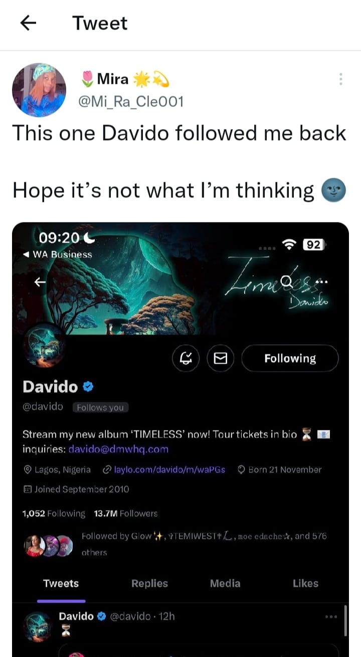 “I feel like I’m pregnant already” – Lady shares screenshot as Davido follows her back on Twitter