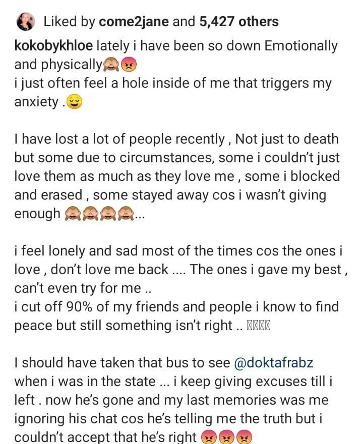 Khloe has taken to Instagram to write that she’s emotionally and physically down. As she narrates how she has lost friends and loved ones, not just to death but other unseen circumstances.