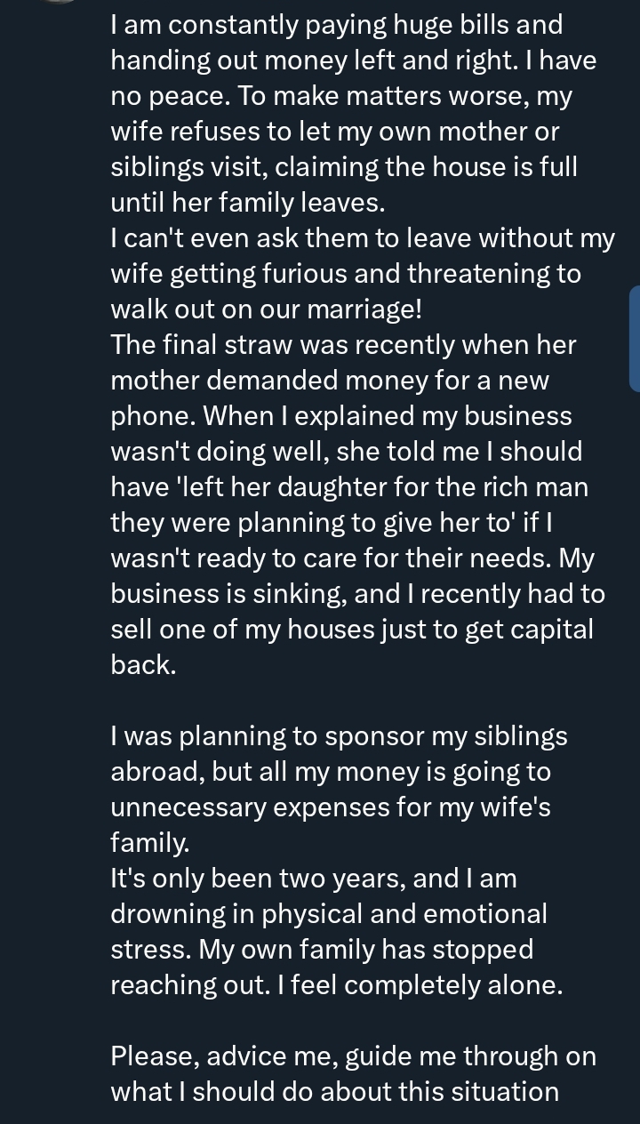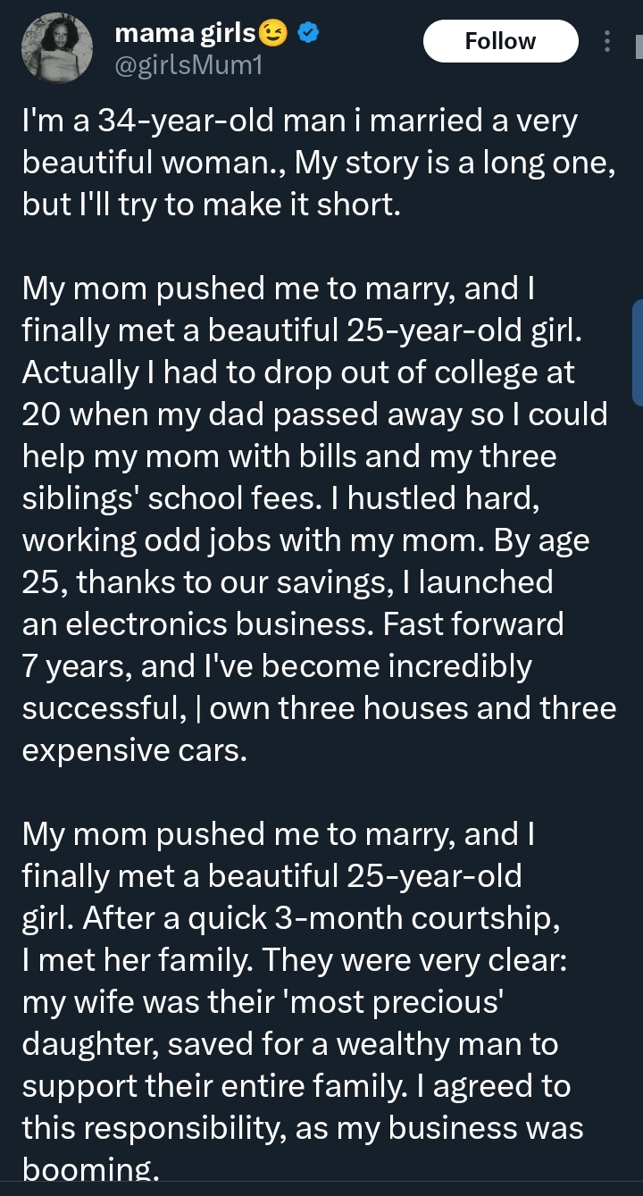 A 34-year-old businessman has shared his emotional struggle over what he described as overwhelming financial and family pressure following his marriage to a younger woman.