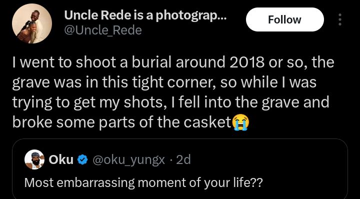 A professional photographer has recounted what he describes as the most embarrassing moment of his career, after an accident at a burial site left him both shocked and humiliated.