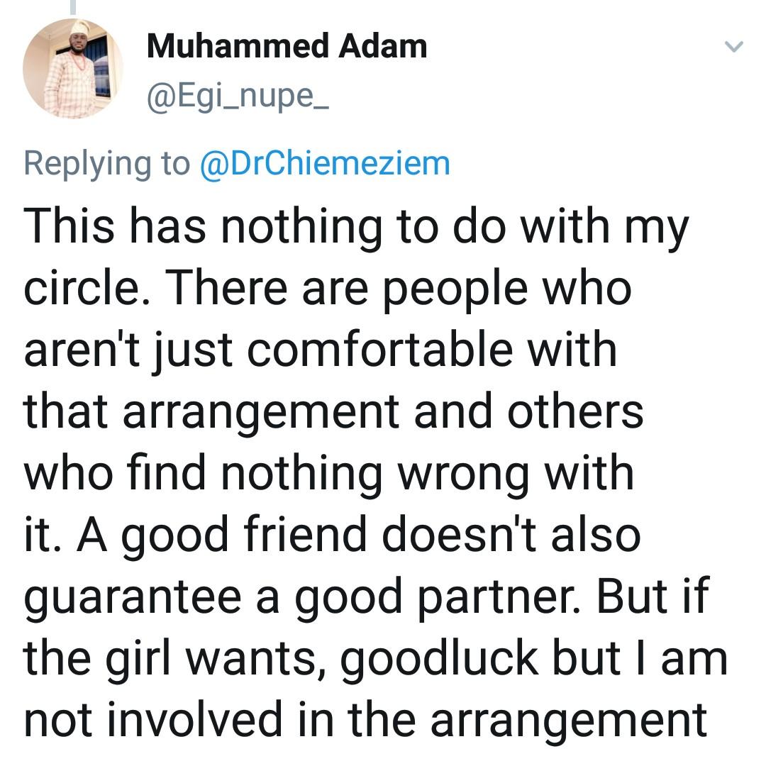 This has nothing to do with my circle. There are people who aren’t just comfortable with that arrangement and others who find nothing wrong with it. A good friend doesn’t also guarantee a good partner. But if the girl wants, goodluck but I am not involved in the arrangement”.