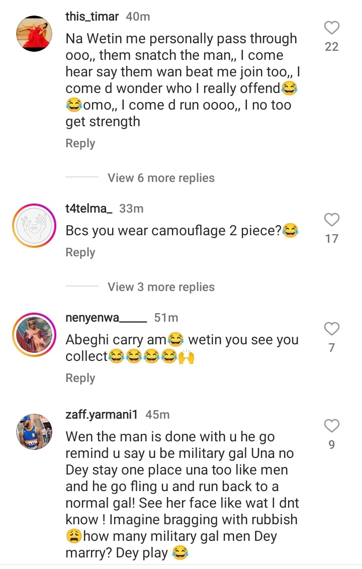 zaff.yarmani1 wrote: “Wen the man is done with u he go remind u say u be military gal Una no Dey stay one place una too like men and he go fling u and run back to a normal gal! See her face like wat I dnt know ! Imagine bragging with rubbish how many military gal men Dey manrrry? Dey play”