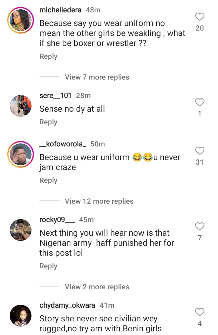 rockyO9__ wrote: “Next thing you will hear now is that Nigerian army haff punished her for this post lol”