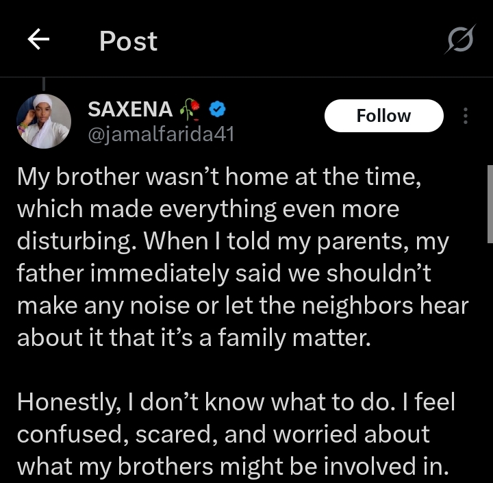 Sharing the aftermath of what transpired, @jamalfarida41 narrated, “When I told my parents, my father immediately said we shouldn’t make any noise or let the neighbors hear about it that it’s a family matter.Honestly, I don’t know what to do. I feel confused, scared, and worried about what my brothers might be involved in”.