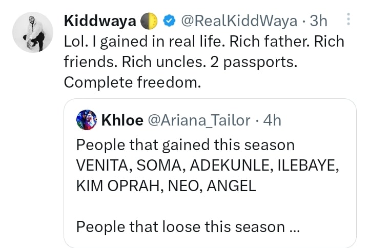 In reaction, Kiddwaya said that he has gained a lot of things in real life, including a rich father, uncle, friends and two passports.