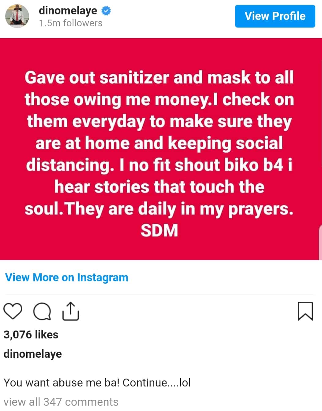 Former senator, Dino Melaye, recently humored his followers on photo sharing app, Instagram, after sharing how he has been caring for his debtors amidst the coronavirus pandemic.