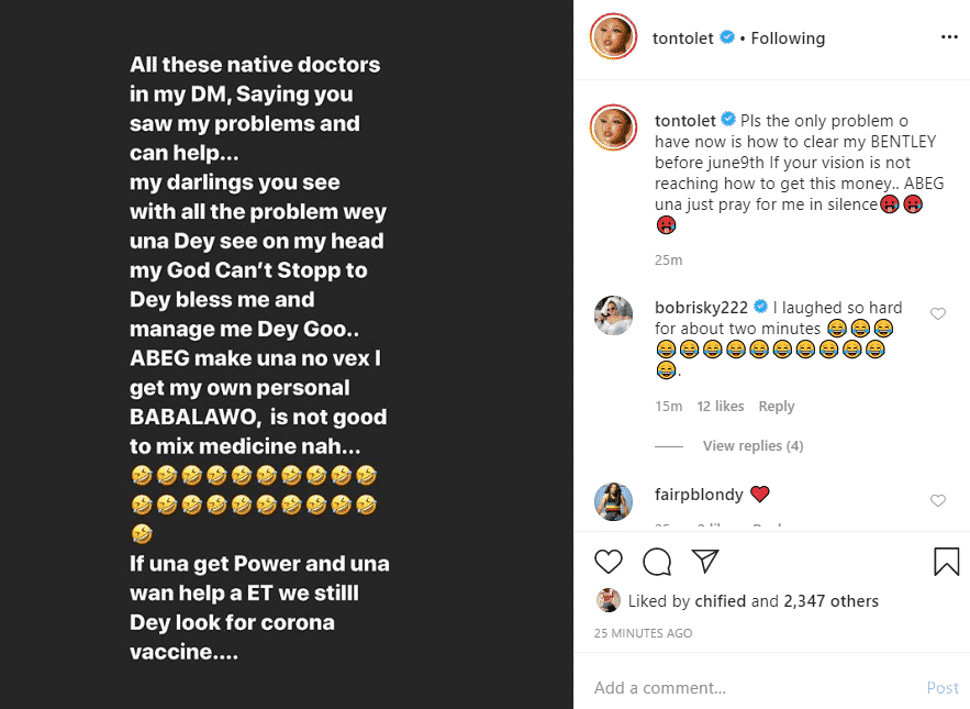 “Pls the only problem o have now is how to clear my BENTLEY before june9th If your vision is not reaching how to get this money.. ABEG una just pray for me in silence???”