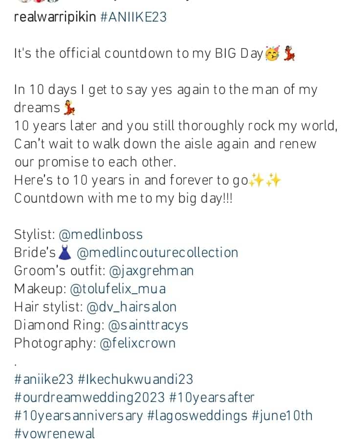 With just 10 days remaining until the highly anticipated event, Warri Pikin’s fans are eagerly counting down alongside her, eagerly awaiting glimpses into her dream wedding.