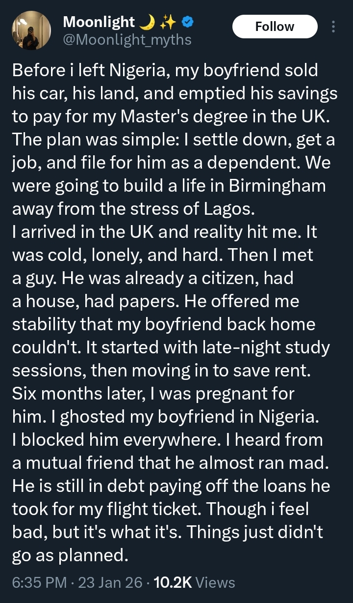 In the post, the woman admitted that her boyfriend in Nigeria sold his car, land, and emptied his savings to fund her education and relocation, with hopes of joining her later.